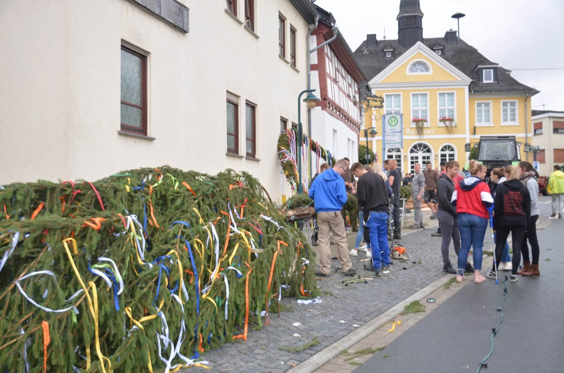 Villmar. Nach dem erfolgreichen Kirmesstart am Freitag Abend mit der super Hüttengaudi mit den Bayermänn” hieß es am Samstag morgen alle Kräfte sammeln, um gemeinsam mit einigen Helfern den traditionellen Kirmesbaum vor dem Rathaus aufzustellen. Von zahlreichen selbsternannten “Baumaufstellfachleuten” beobachtet und mit zahlreichen Tipps ausgestattet hieß es zunächst einmal den Baum ein wenig zu “verhübschen”. Diese Aufgabe übernahmen erfolgreich die Kirmesmädchen, während sich die Jungs um die Elektroinstallation kümmerten. Nach längeren umfangreichen Vorarbeiten war es dann endlich soweit und der über 20 Meter hohe Kirmesbaum stand zügig, kerzengerade an seinem vorgesehenen Platz. Jetzt war weithin sichtbar das das Wochenende ganz im Zeichen der traditionellen Villmarer Kirmes steht. (hvo)